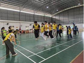 活动开篇亮点纷呈,各小组快速确定组名、口号并进行创意展示,气势如虹的口号与独具特色的造型点燃现场氛围。热身环节后,五大闯关游戏依次展开,既考体能更拼协作:接力运球时,学员们手握球拍托球、怀抱篮球冲刺、筷子夹球稳走,展现了不气馁的拼搏精神;投篮接力场上,学员精准投射、默契接力,补投时的坚持赢得阵阵叫好;抛圈套瓶环节,运气与技巧交织,累计得分的悬念让氛围持续升温;猜歌名游戏掀起互动高潮,各组抢答踊跃、欢乐融洽;团体跳绳中,甩绳与跳绳学员节奏同步,“一二、一二”的口号声彰显强大团队协作力。
