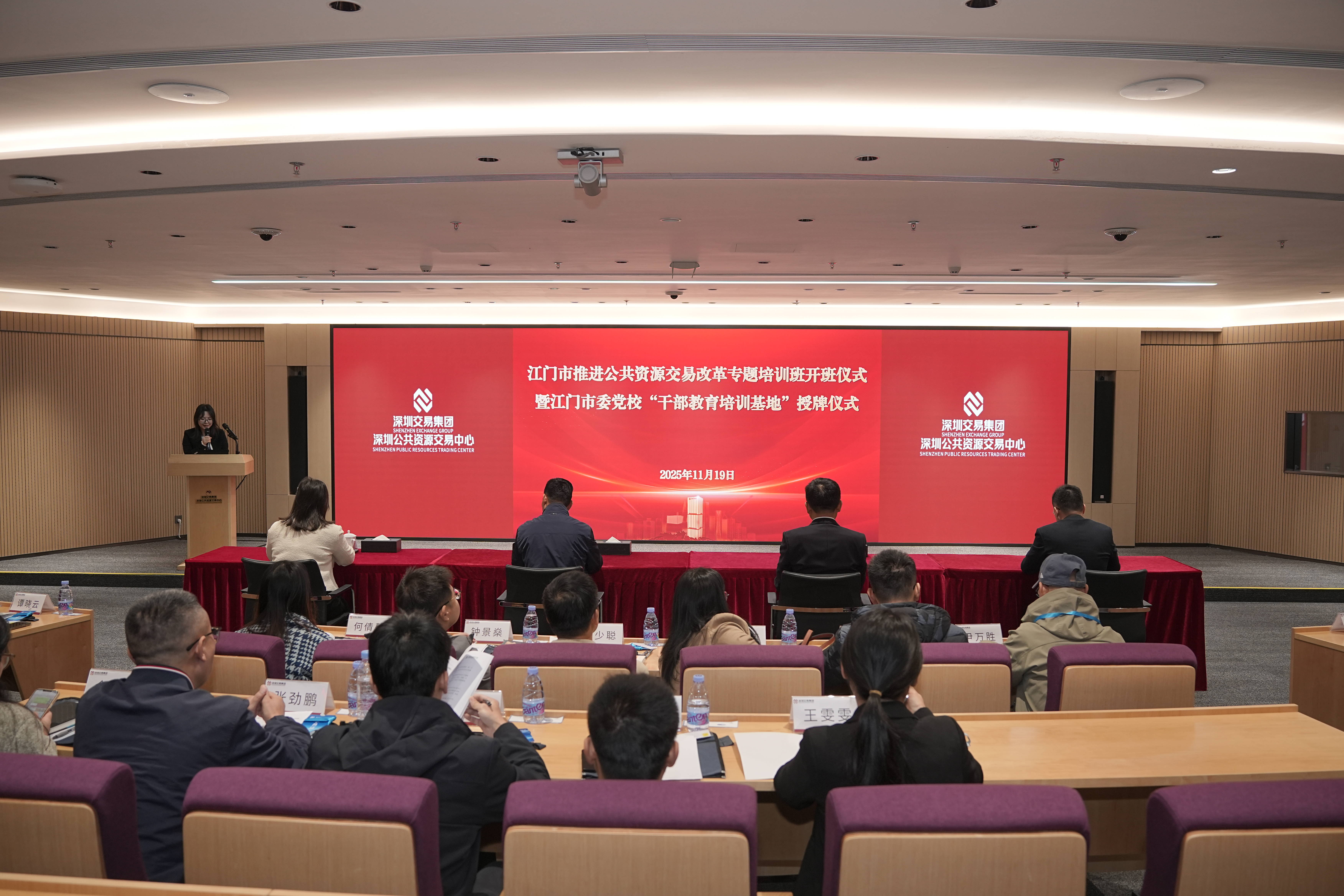 近日,江门市委党校与深圳交易研究院共建干部教育培训基地活动在深圳交易集团总部顺利举行,江门市委党校常务副校长张学东、深圳交易研究院副总经理林丹妮共同出席活动。随后,江门市推进公共资源交易改革专题培训班开班,标志着双方战略合作正式启动。